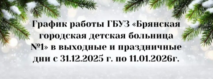 График работы ГБУЗ «Брянская городская детская больница №1» в выходные и праздничные дни с 31.12.2025 г. по 11.01.2026г. Работа стационара Круглосуточный стационар по графику работы учреждения Оториноларингологический дневной стационар 31.12.2025 г. – 04.01.2026г. - выходные дни 05.01.2026 г. – с 08-00 до 12-00 06.01.2026 г. - с 08-00 до 12-00 07.01.2026 г.– выходной день 08.01.2026 г. – с 08-00 до 12-00 09.01.2026 г. - с 08-00 до 12-00 10.01.2026 г. – 11.01.2026 г. – выходные дни Дневной стационар 31.12.2025 г. – 04.01.2026г. - выходные дни 05.01.2026 г. – с 08-00 до 12-00 06.01.2026 г. - с 08-00 до 12-00 07.01.2026 г.– выходной день 08.01.2026 г. – с 08-00 до 12-00 09.01.2026 г. - с 08-00 до 12-00 10.01.2026 г. – 11.01.2026 г. – выходные дни Физиотерапевтическое отделение 31.12.2025 г. – 04.01.2026г. - выходные дни 05.01.2026 г. – с 08-00 до 13-00 06.01.2026 г. - с 08-00 до 13-00 07.01.2026 г.– выходной день 08.01.2026 г. – с 08-00 до 13-00 09.01.2026 г. - с 08-00 до 13-00 10.01.2026 г. – 11.01.2026 г. – выходные дни